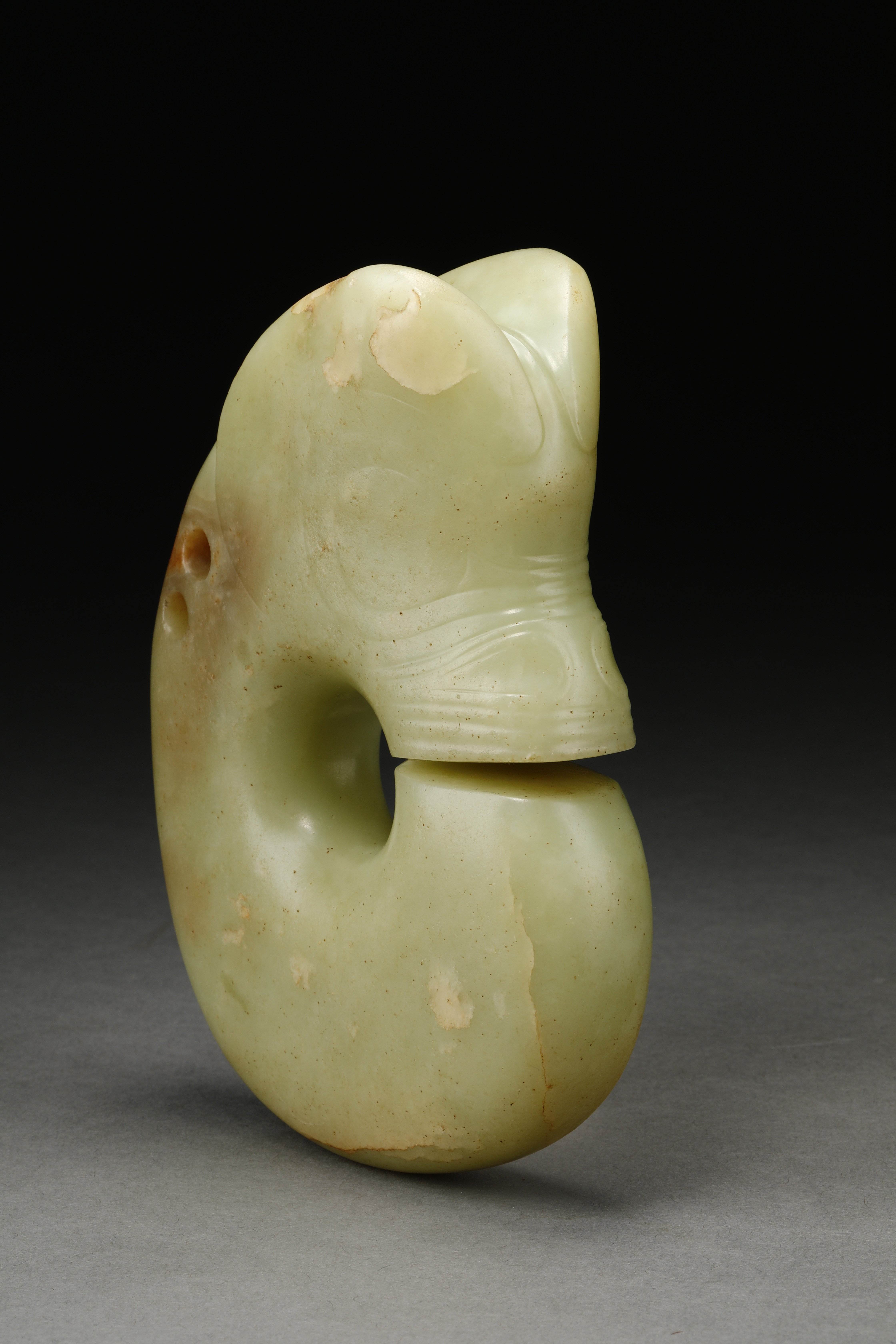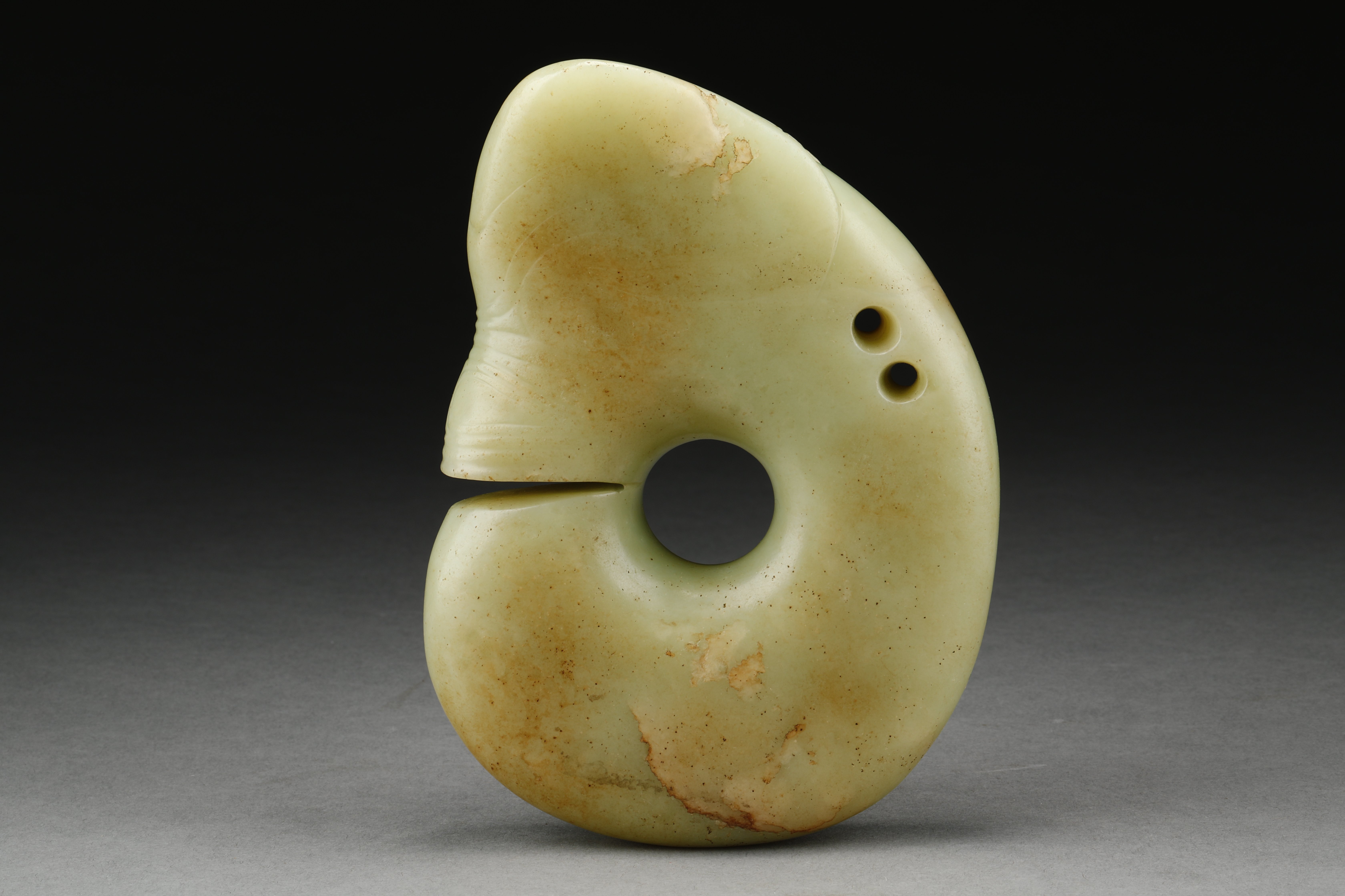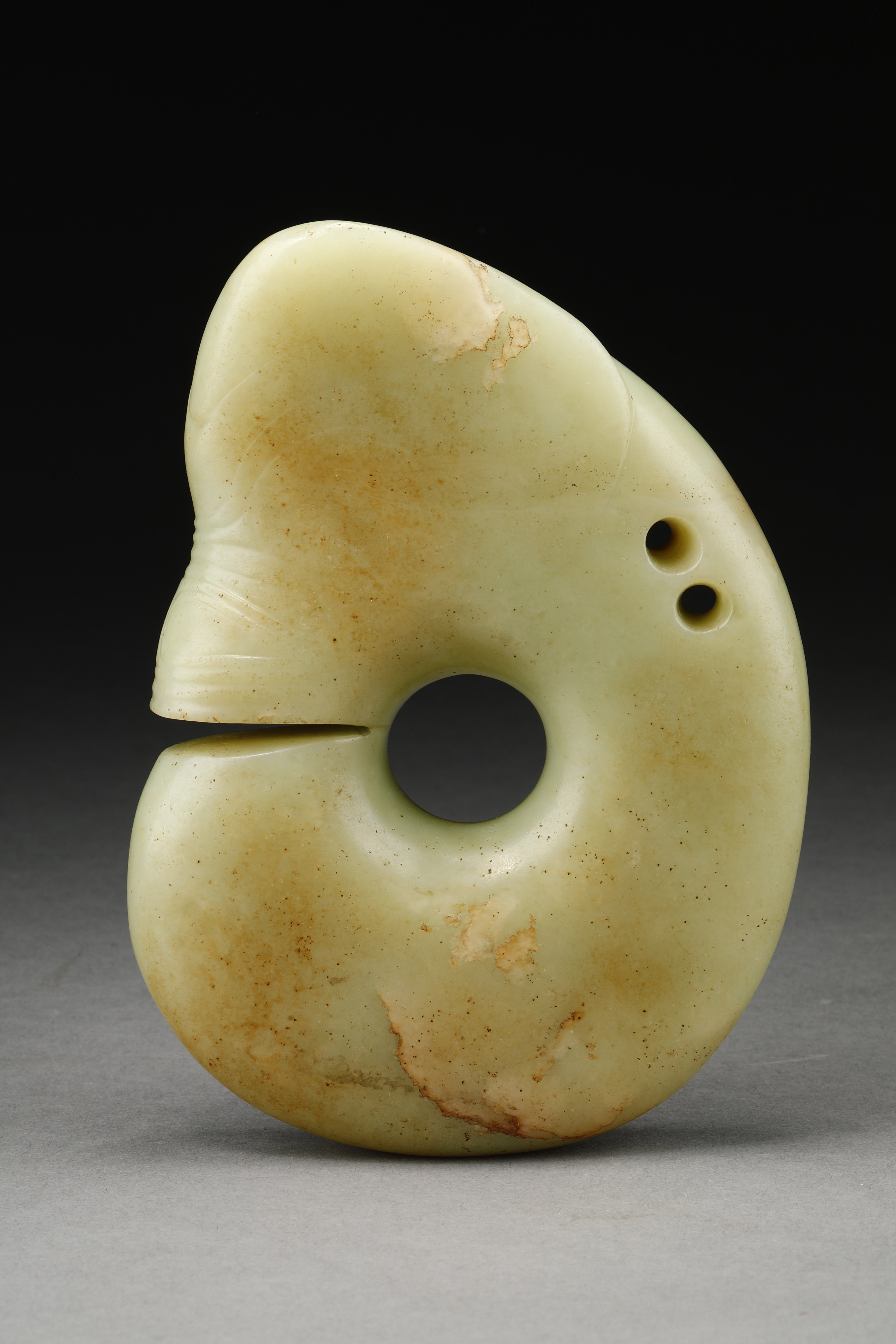 玉猪龙,又名玉兽玦,被认为是龙的最早雏形。但由于外形特殊,考古界对于该玉器定义为猪还是龙争议颇多,还有人认为是熊。其用途尚不明确,多认为是宗教礼器。此件玉猪龙材质为岫岩软玉,整体呈“C”形,浅黄色,身体首尾相连,呈团状卷曲,口微张,肥首大耳、吻部平齐,三角形切口不切透内圆,背部对穿双孔,面部以阴刻线表现眼圈、皱纹。