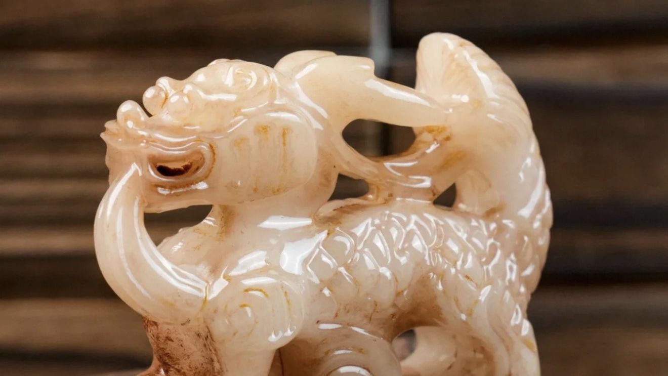 从佩饰到陈设,玉兽自是玉器独特的部分,贴合自然,野趣十足。犼象征勇敢、忠诚和正义,在古代也被视为能驱邪避害的神兽。玉兽自然蹲坐,昂首向前,线条细腻生动,栩栩如生。