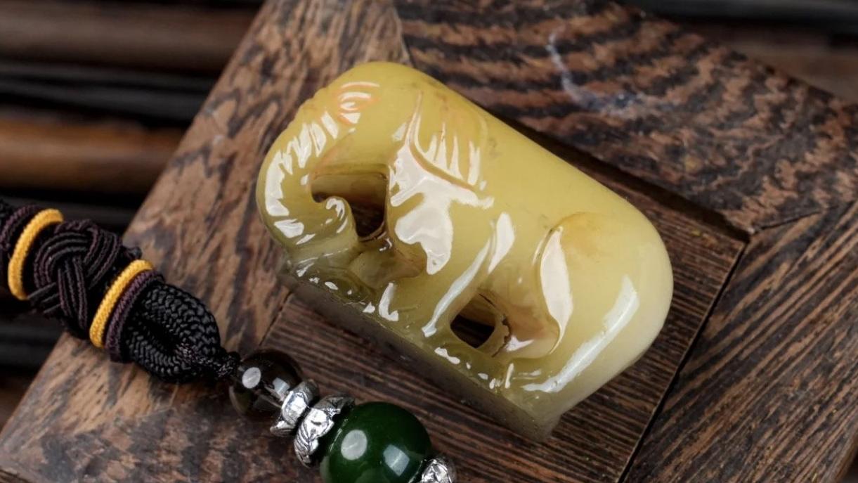 象与祥谐音,也象征了力量与智慧。展品玉象为圆雕,大象呈站立状,长鼻自然下垂后卷,足底雕刻祥云。