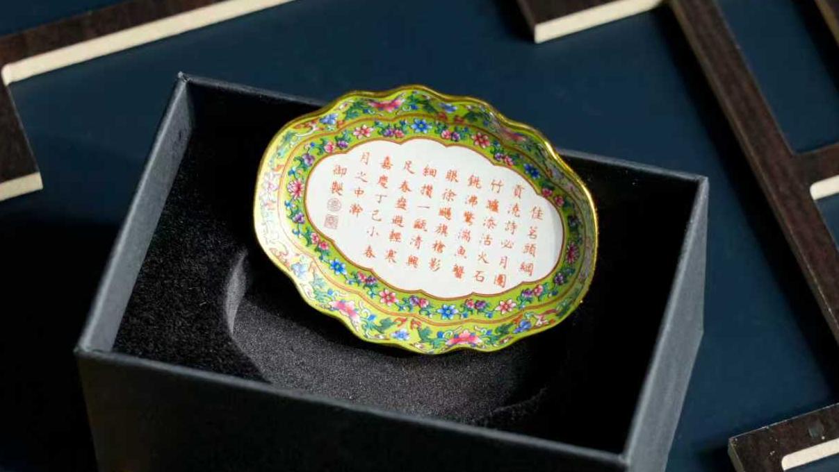 茶盘整体为海棠形,以淡绿为地,上绘粉彩折枝莲纹,并用金彩分隔画面,内底海棠形开光内以矾红彩写有嘉靖帝御制诗一首:“佳茗头纲贡,浇诗必月团。竹炉添活火,石铫沸惊湍。鱼蟹眼徐扬,旗枪影细攒。一瓯清兴足,春盎避清寒。”,落款“嘉庆丁巳小春月之中澣御制”,此类写有御题诗茶具还有盖碗及茶壶,为皇帝在每年元旦后三日在重华宫举行茶宴时所用。