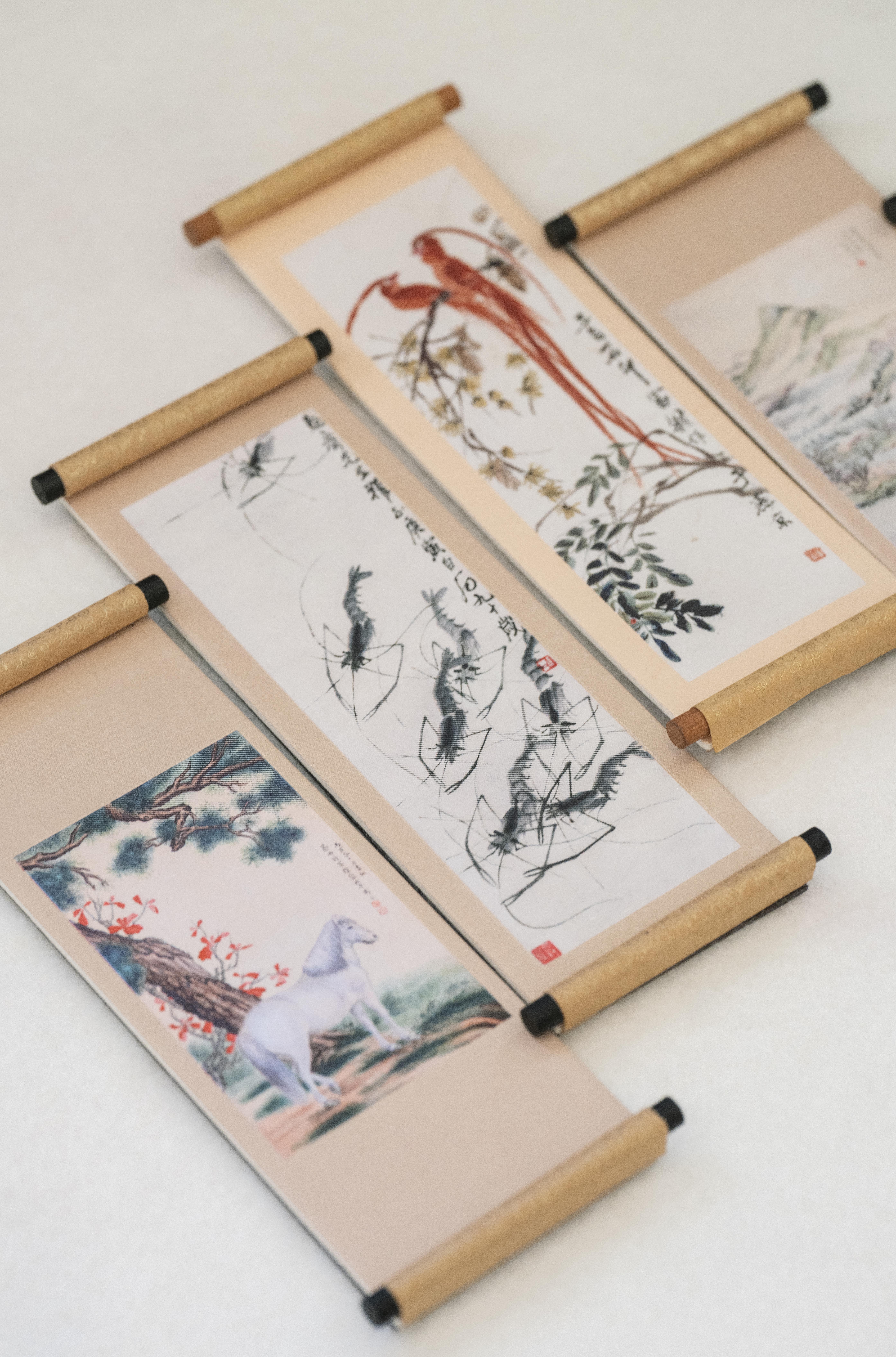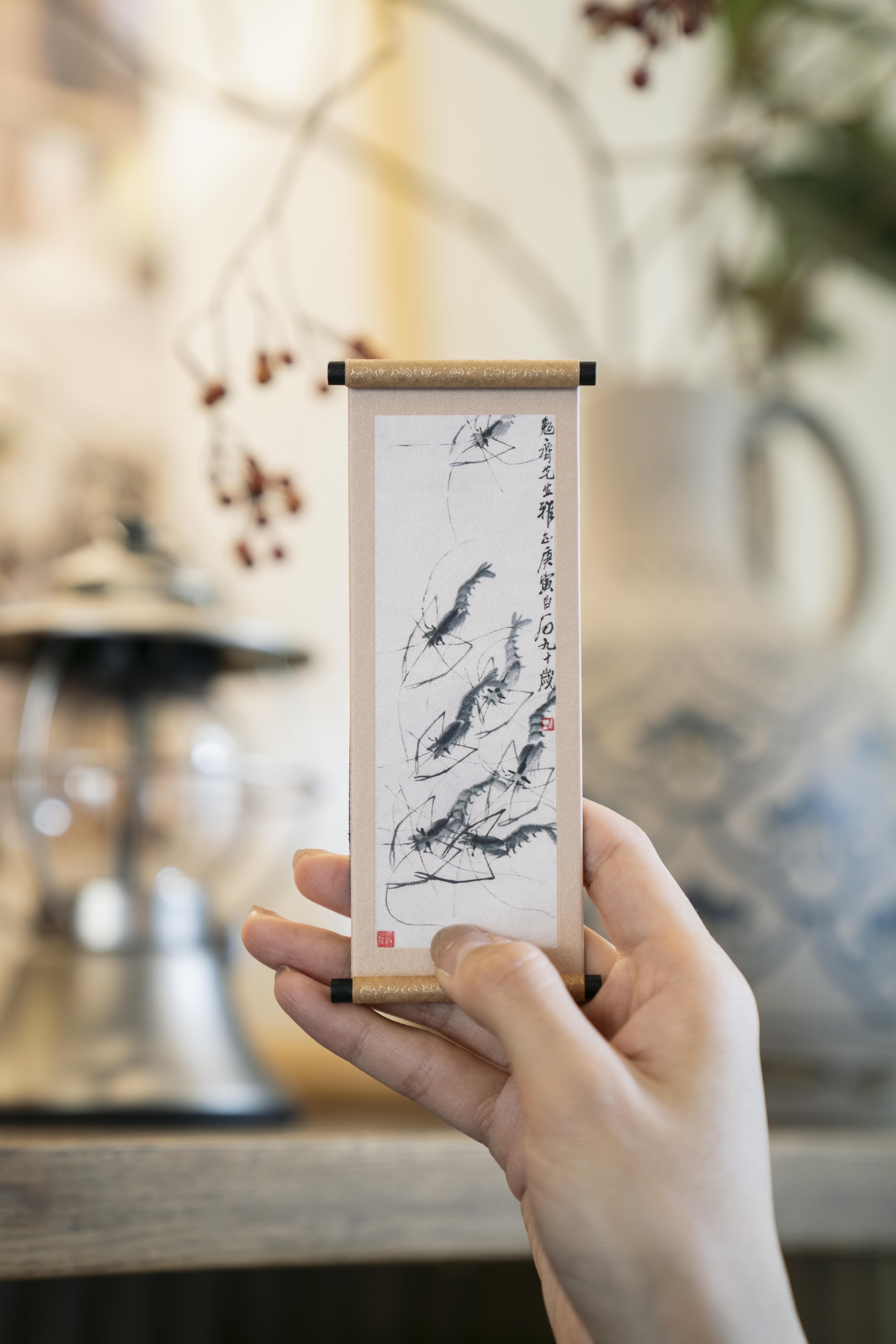 以齐白石《虾》《荷花》、吴镜汀《江南山水》、马晋《马》等交流中心馆藏名家书画为灵感,古代画轴造型样式,既还原绢本质感,又适配现代冰箱的强磁吸附需求。