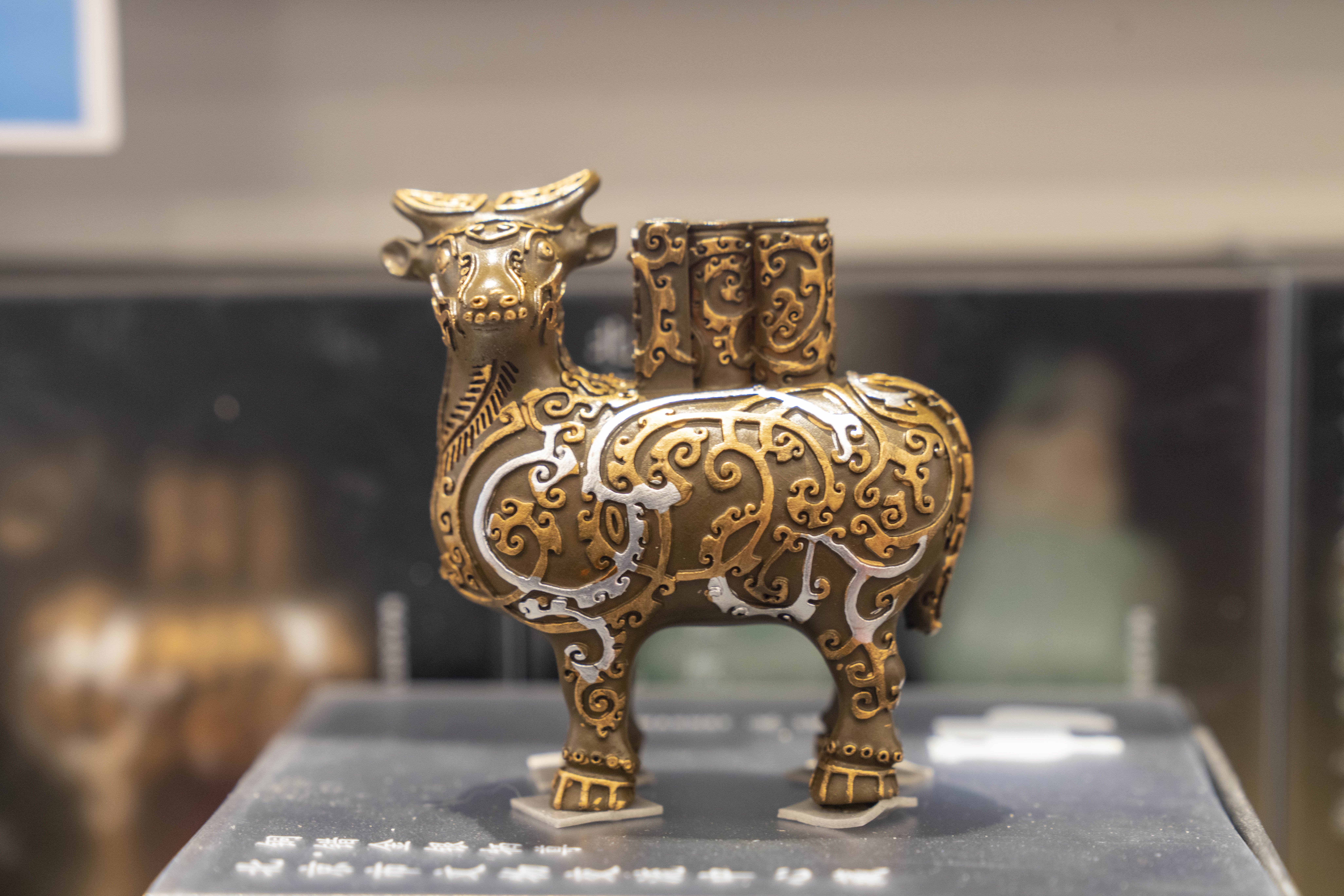 牺尊属清乾隆时期,尊是容酒器,从外形看分为大口有肩尊、大口简形尊和动物形尊等。动物形尊又称牺尊,是一种动物造型的容酒器,用于祭祀,之后多为实用器。此牺尊为一头牛的形象,牛挺胸回首,双目圆睁,双耳双角挺直,身体丰腴饱满,四肢粗壮有力,足呈蹄状,足后跟凸起的小距趾被精细塑造,尾下垂,牛背相连筒状作以受酒,器物全身遍布错金银图案,整体器型浑厚大方,牛的神情朴实生动。